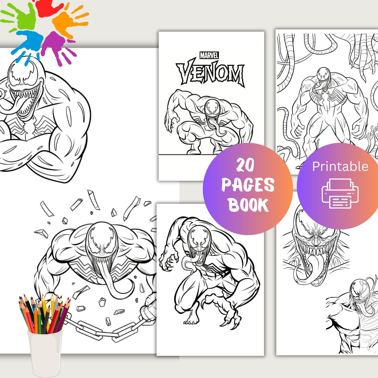 Dive into the dark and thrilling world of Venom with this 20-page, printable coloring collection. Each page features bold, action-packed illustrations of Venom, perfect for fans of the iconic antihero.